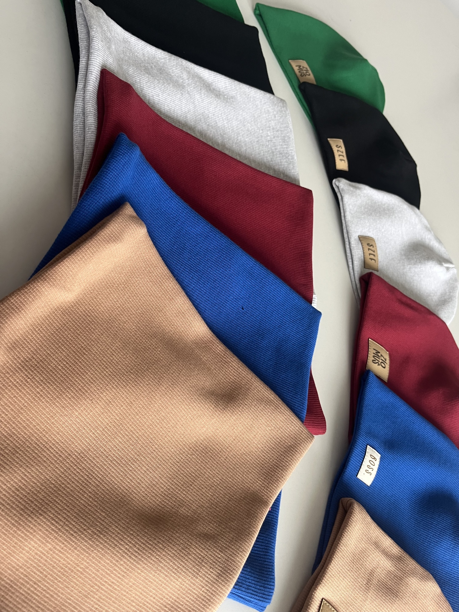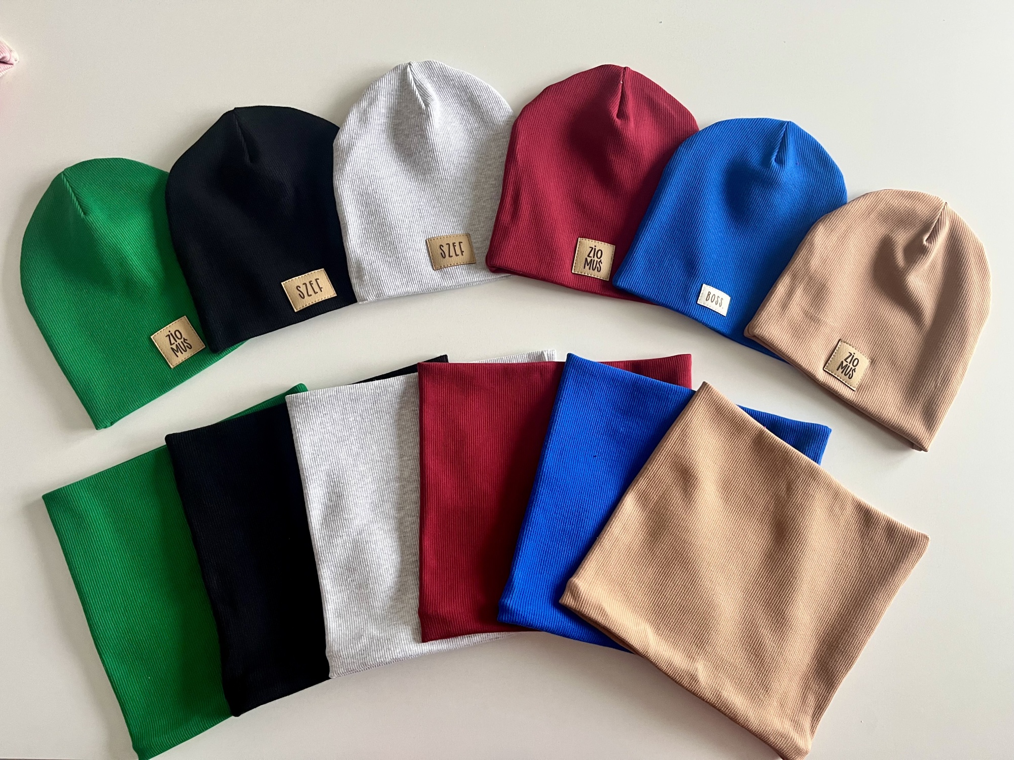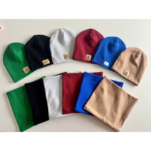 Komplet składający się z czapki oraz komina. Bawełna prążkowana, podwójna, rozmiar uniwersalny ( pasuje na dziecko w wieku od 1 roku do około 9 lat.